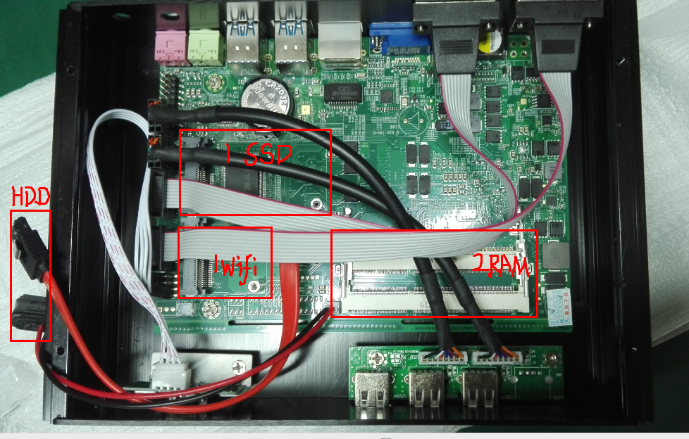 (3)on the left you can see two red cable,which is connect one 2.5 inch HDD to the motherboard,and this HDD can be fixed on the back of the cover.