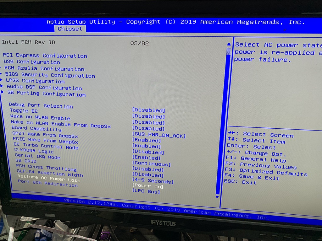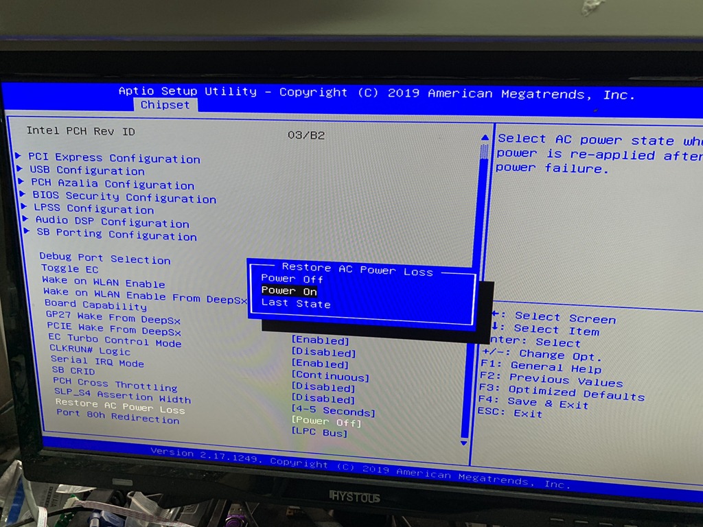 3. In this screen you can enable or disable wake on lan function, Restore AC Power Loss and others. Restore AC Power Loss is the one we are talking here, click to select the right one you want will be OK.