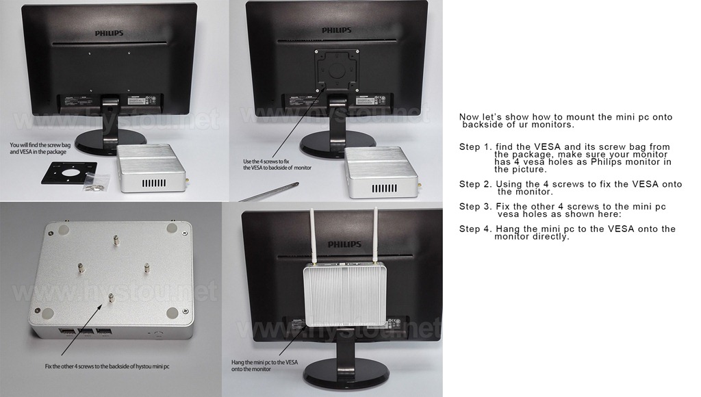 Now let’s show how to mount the mini pc onto backside of ur monitors.