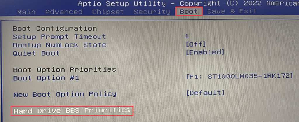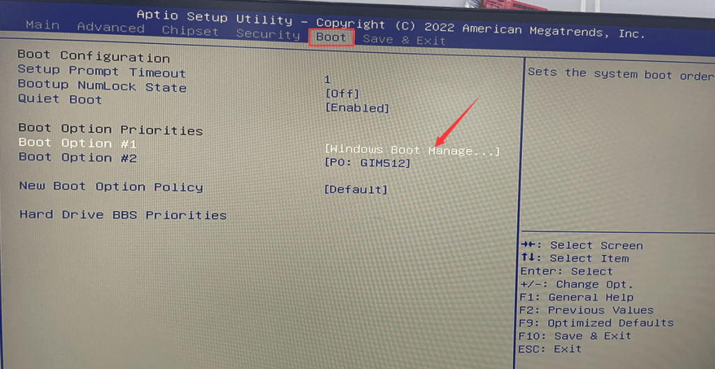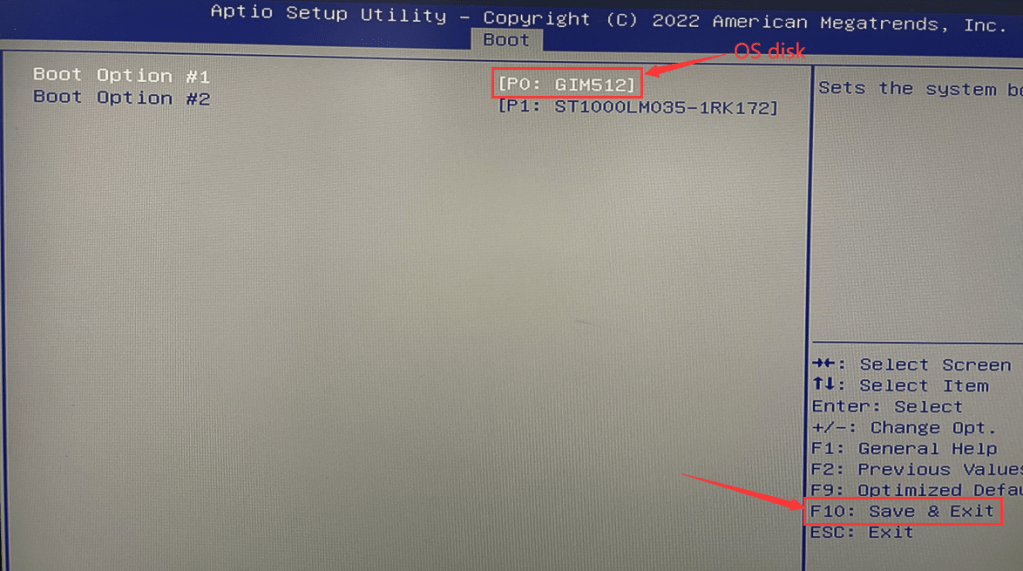 1-1. Press the keyboard Ctrl+Alt+Del key to restart. After restarting, quickly tap the keyboard Del key to enter the BIOS Setup, and then select Boot>Hard Drive BBS priorites>Boot Option #1 to set the system hard disk as the first boot item. (In this tutorial, P0: GIM512 is the system disk) After the setting is successful, press F10 to save and exit, and test whether it can enter the operating system normally. (Note: This step is applicable to the operating system installed in Legacy+MBR mode)
